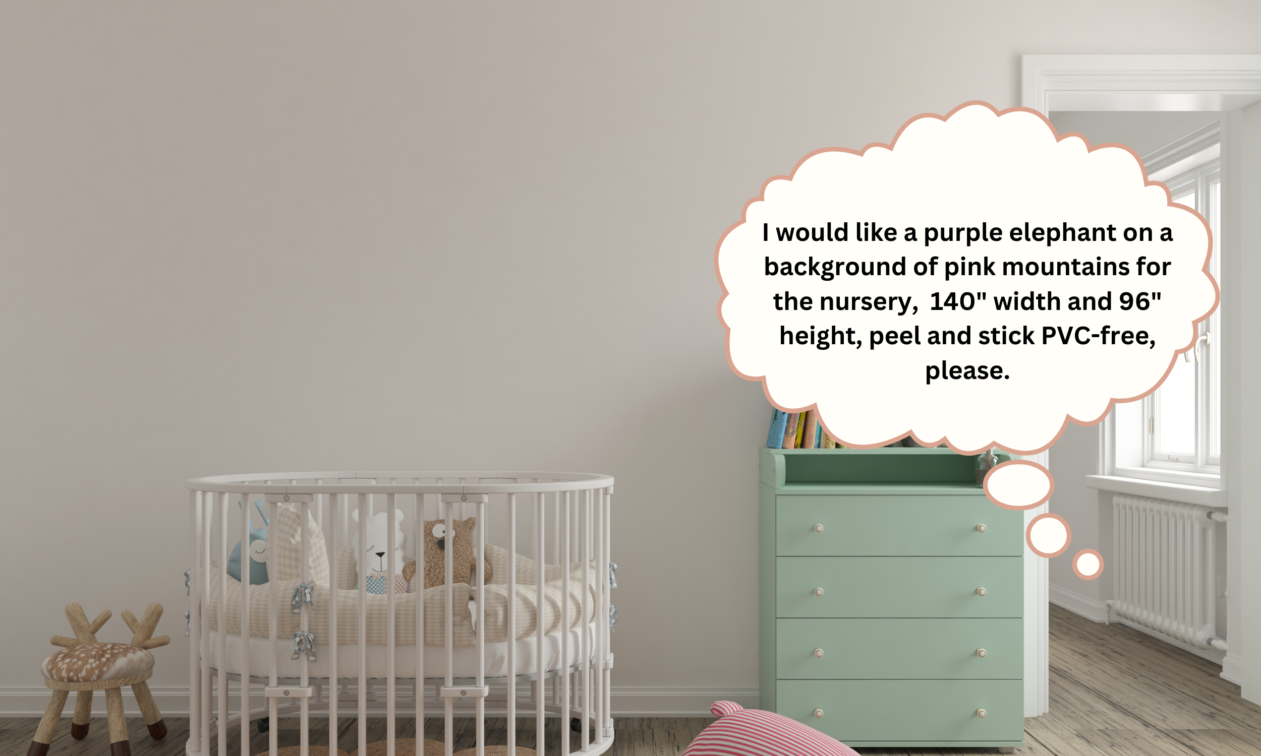 - Provide Your Preferences: Tell us your preferred style, colors, room and any specific elements you want to include. Don't forget to specify your desired dimensions and material.